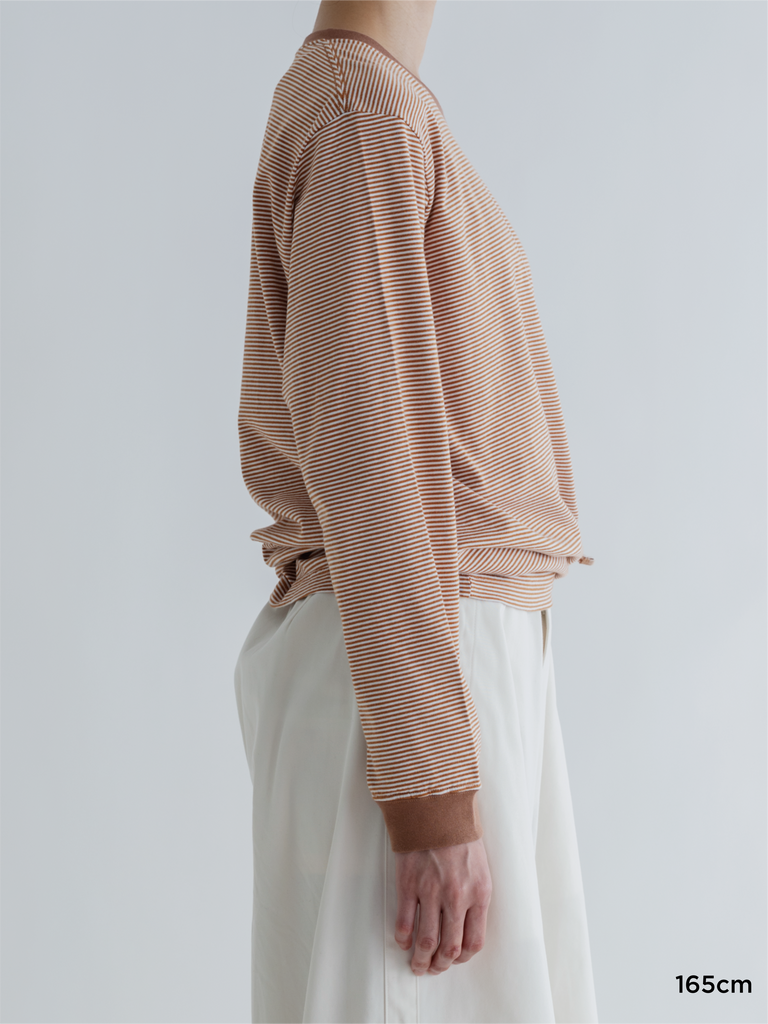 一見無地に見えるような細い幅の繊細なボーダーで、カジュアルになりすぎないように作りました。襟と袖のリブは無地にすることで全体を引き締めています。