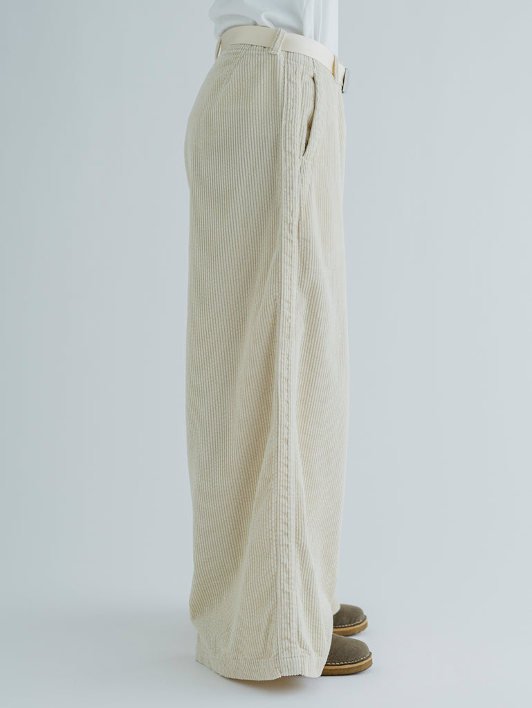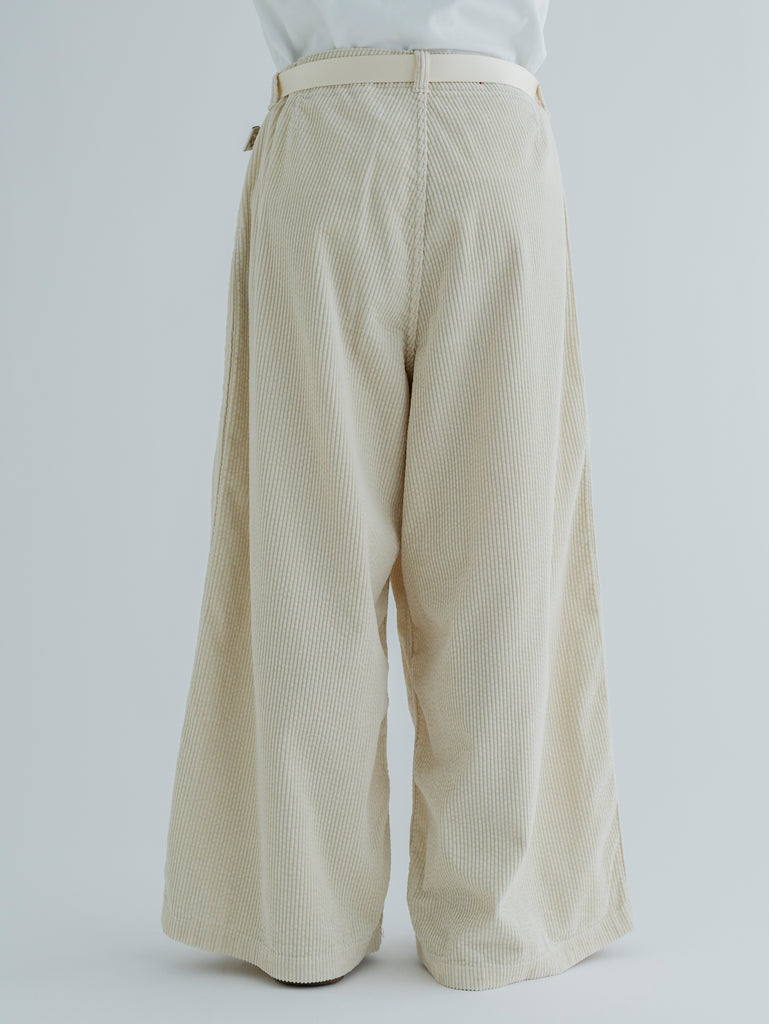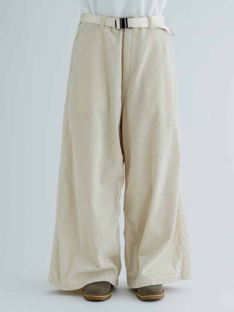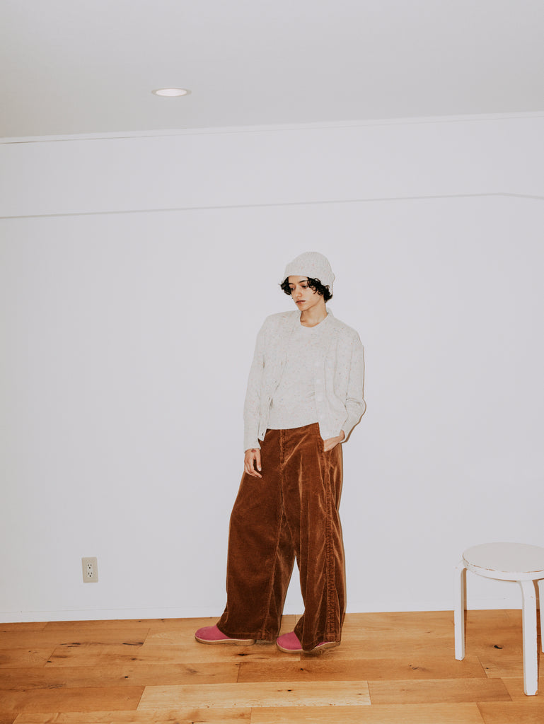 思いっきりワイドなシルエットが特徴のMEYAMEの定番パンツ SIDE LINE WIDE PANTS をこの秋冬はコーデュロイで作りました。