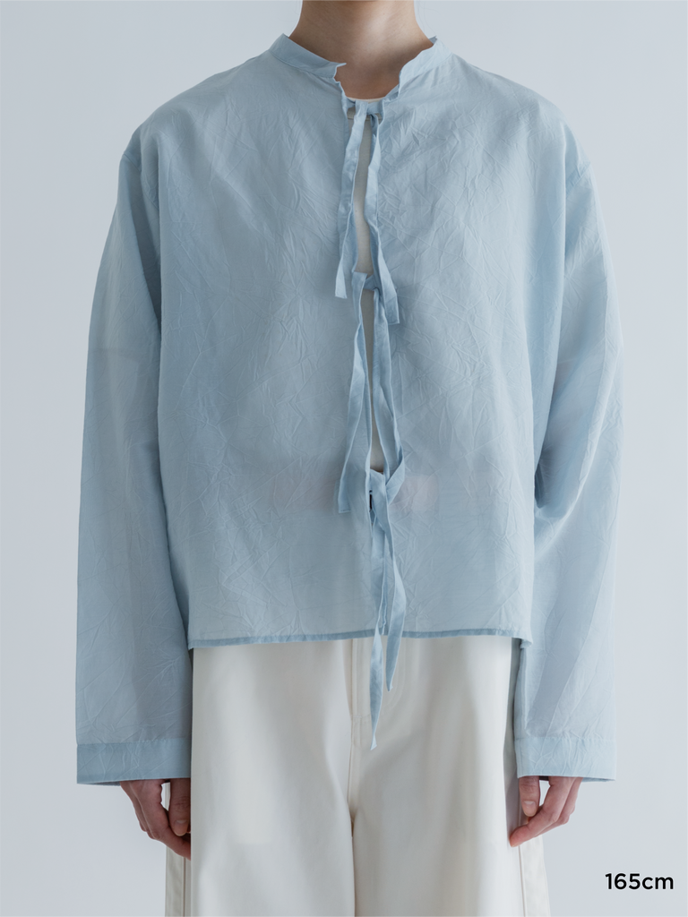 少し光沢と透け感のある生地は、軽く肌あたりの良いやや薄手のコットンシルク。シワ加工を施すことで無地の中にも豊かな表情がある素材に仕上がりました。