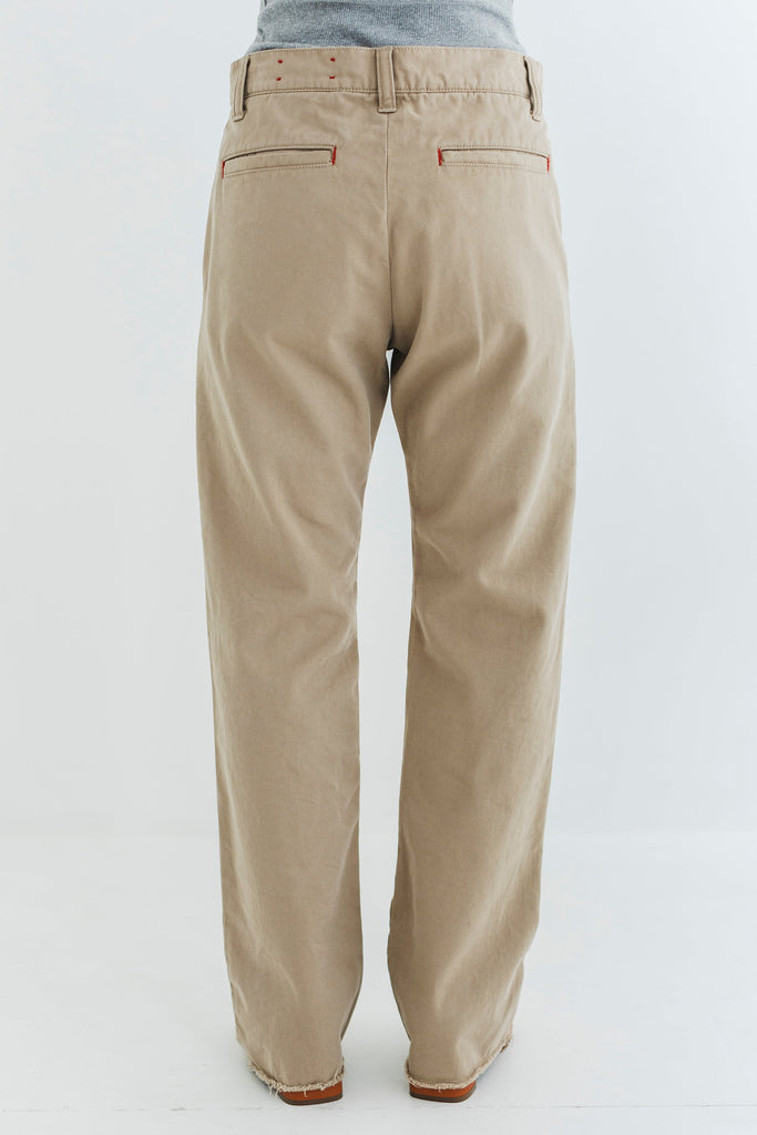 ところどころにブランドカラーである赤いステッチを入れることで、ありそうでないチノパンになりました。
