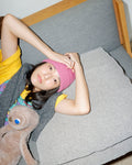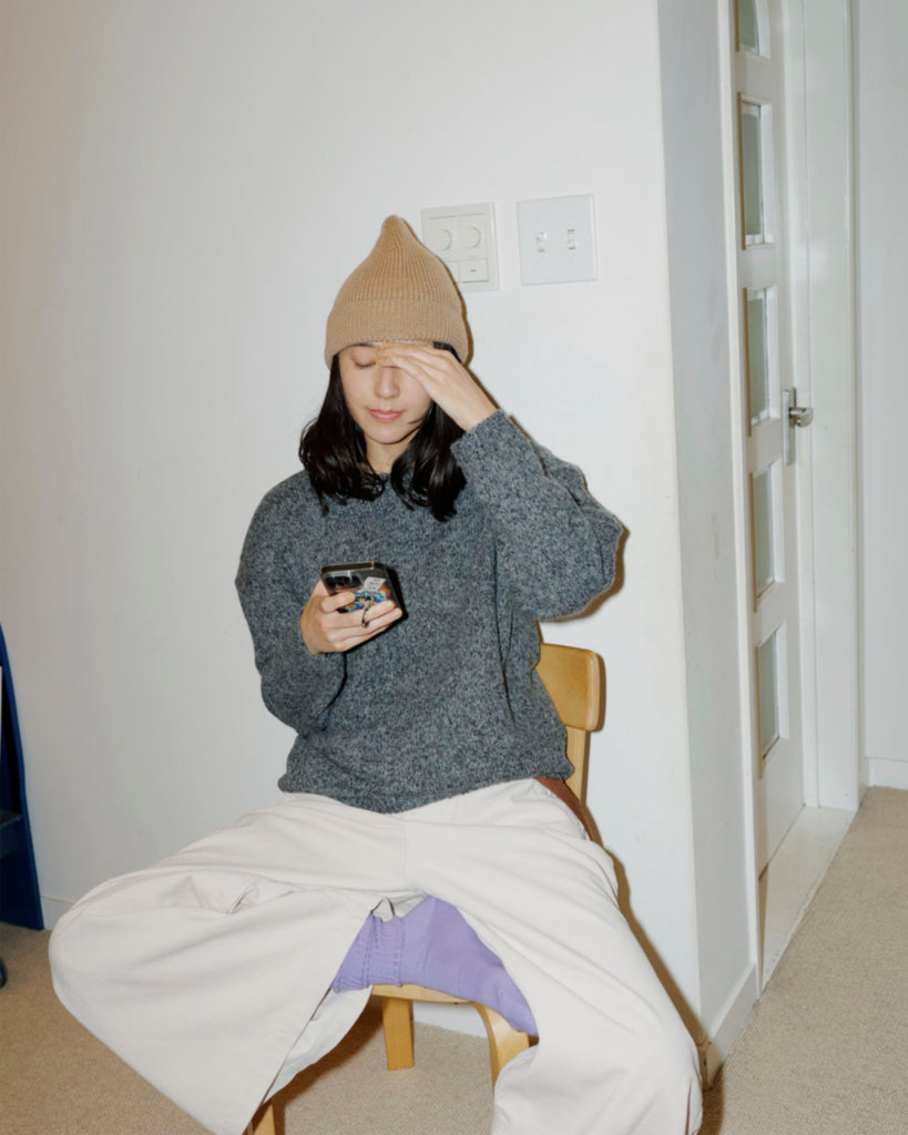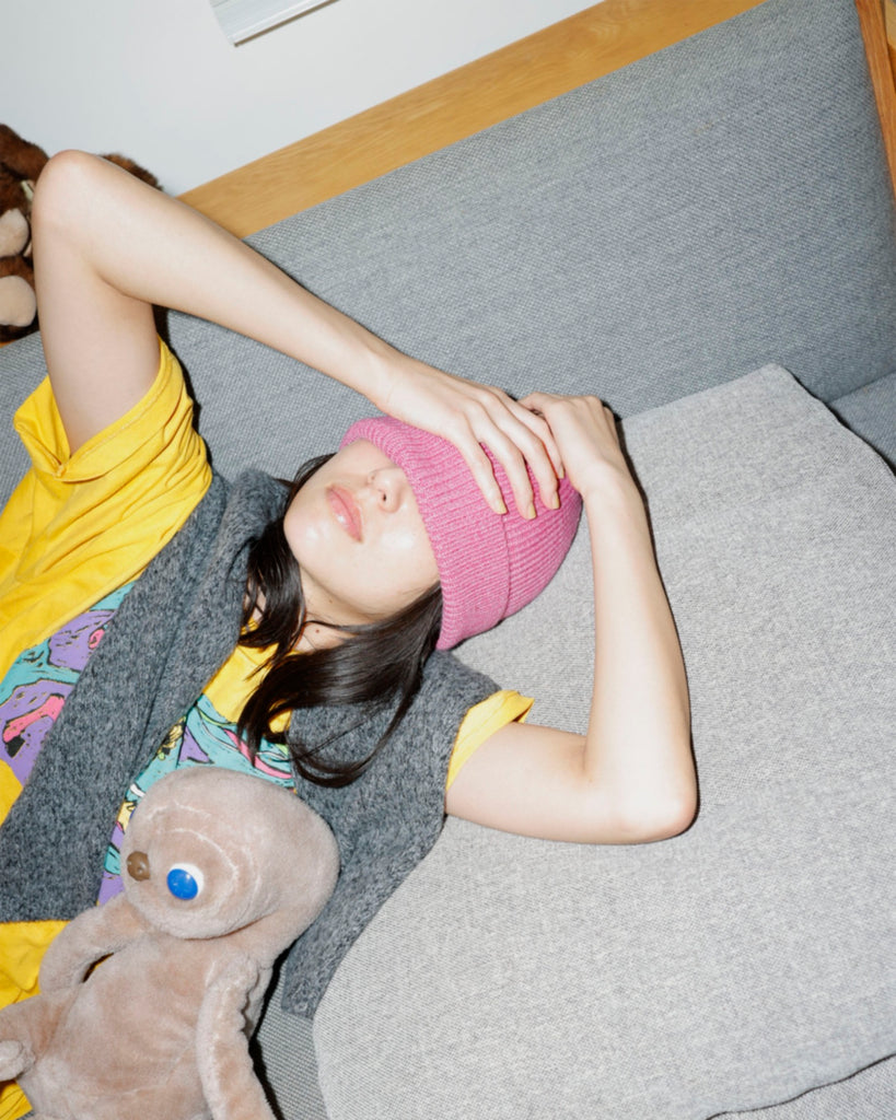 いつものスタイリングにニットキャップが加わると、ぐっと柔らかくこなれた雰囲気に。