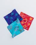 ハンカチとしてはもちろん、スカーフ的に首や頭に巻いたり、バッグに巻いたり、風呂敷のように何かを包むのにと色々な使い方をしています。