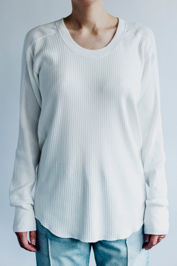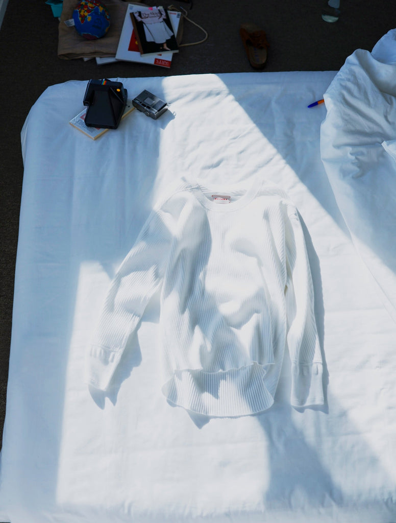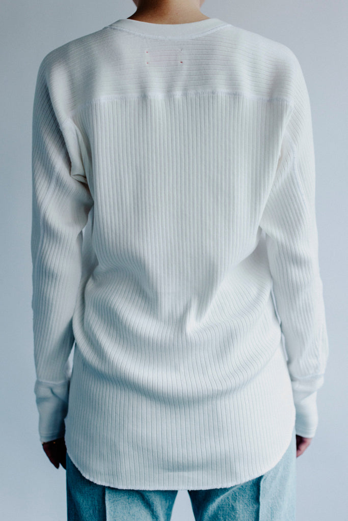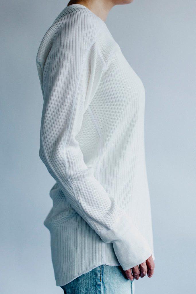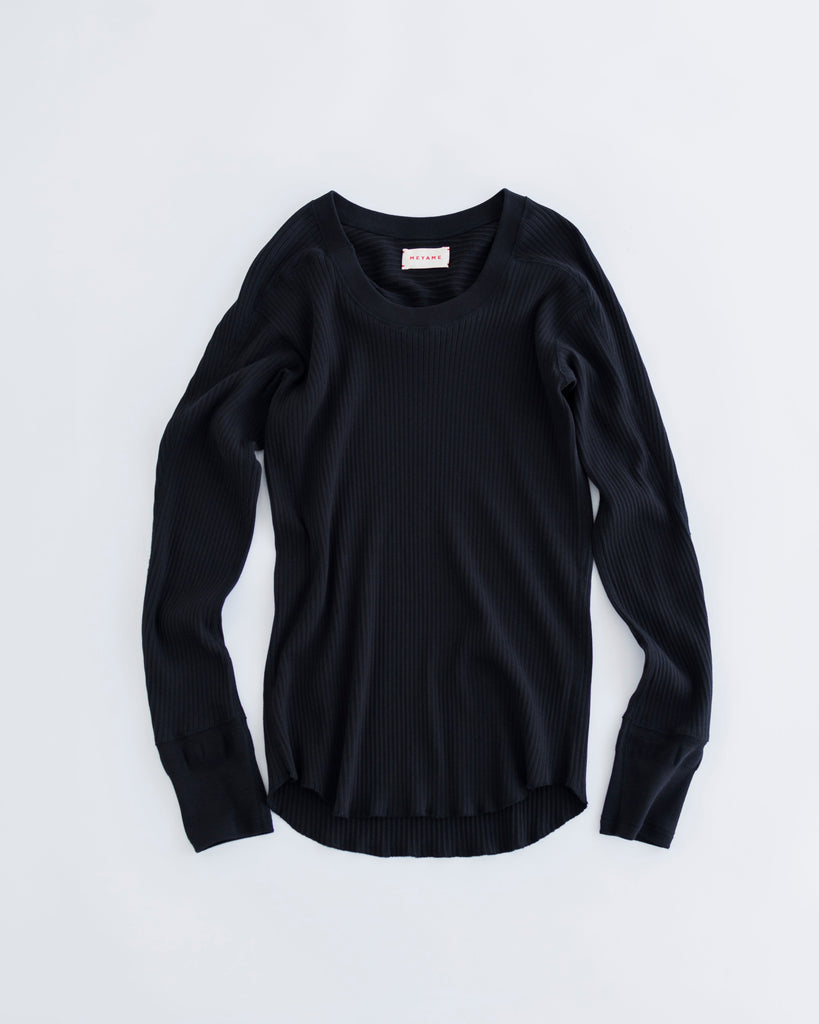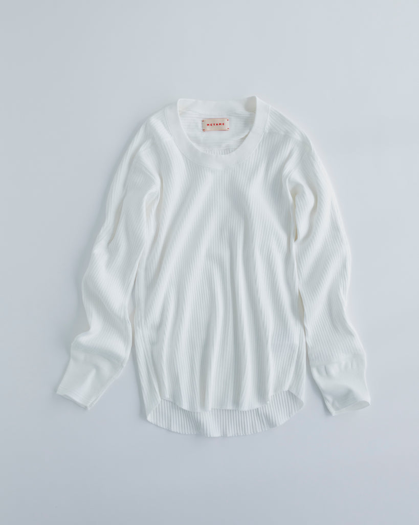 MEYAME の定番 OBLONG NECK RIB PULLOVER は、"カジュアルだけど女性らしい" MEYAME を一番表しているアイテムです。