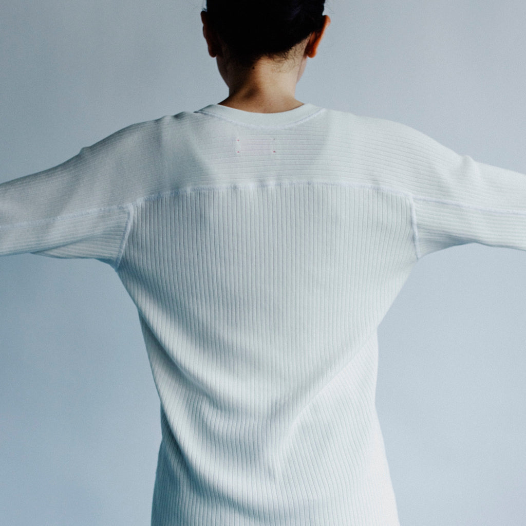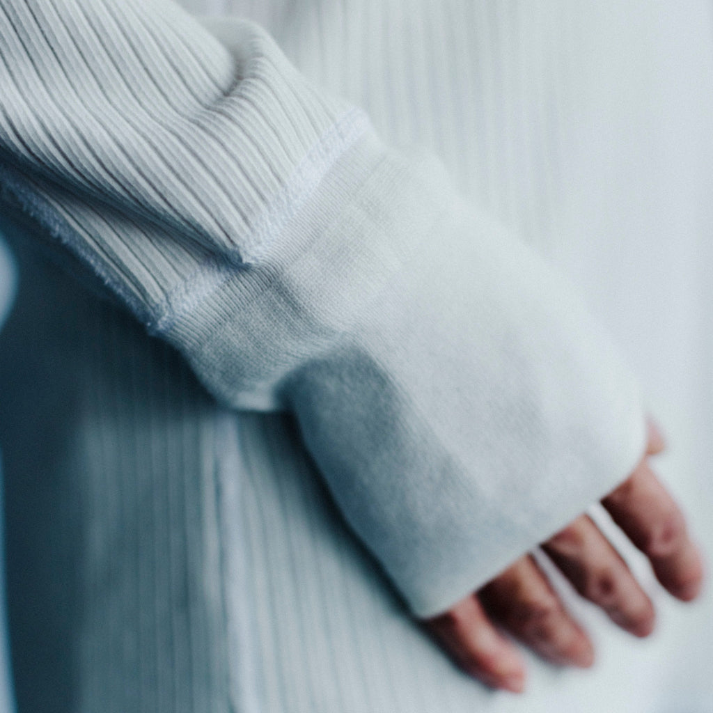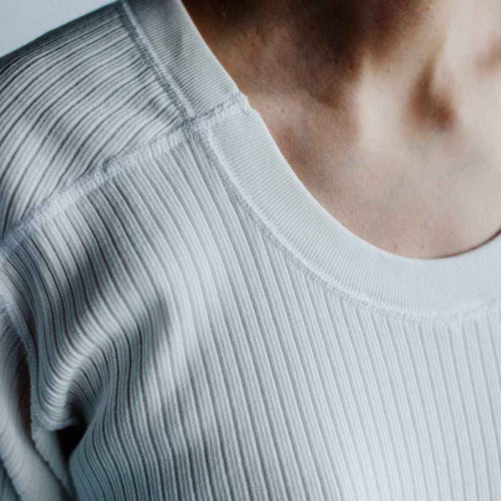 オリジナルで作っている落ち着いた光沢のあるリブ素材は、オーガニックコットン(GOTS認証)を使用し、肌あたりがとても滑らかで快適な着心地。