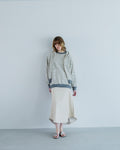 定番の SWITCHING PATTERN SWEAT (*)と同じ形で、着ると少し丸みを帯びるのでバランスが取りやすく、LOOK のようにスカートとのスタイリングはもちろんのこと、ワイドパンツなど様々なボトムスと合わせやすいシルエットです。