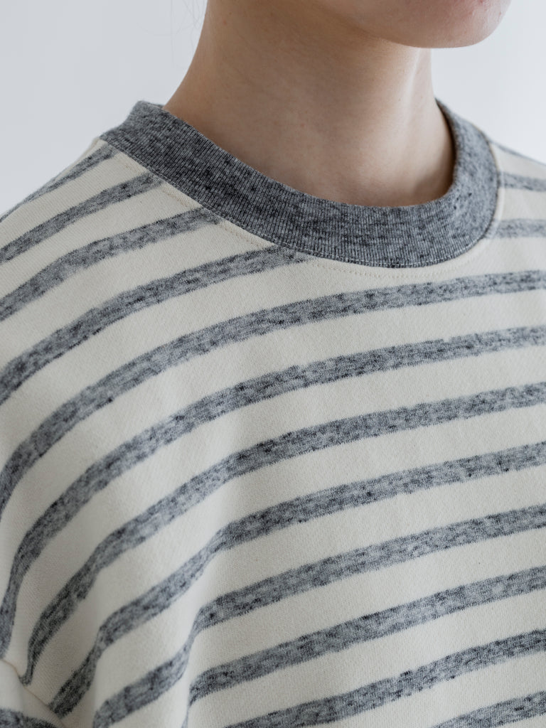 グレーの部分は杢になっていて、色の部分は無地になっています。この杢と無地のボーダーというのは探すと世の中に中々ありません (今までに見られたことがあれば、それはとても貴重です)。見た目も肌触りもMEYAME らしい柔らかで温もりのある素材に仕上がりました。