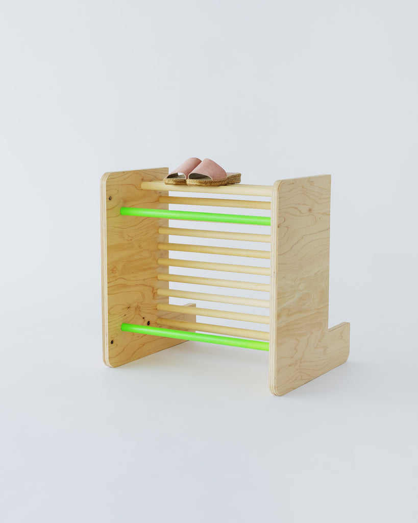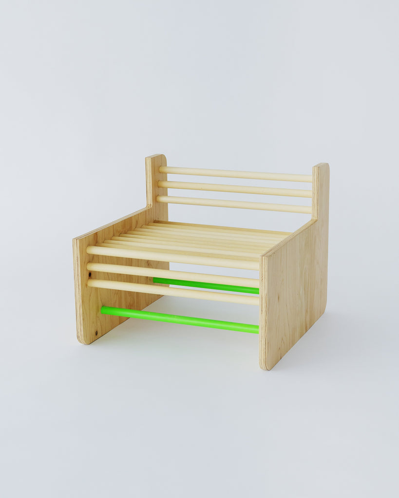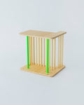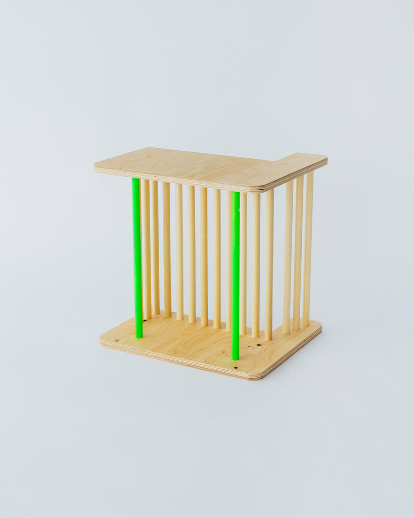 国産ヒノキ合板と南洋⽊材の丸い棒で作られているイスです。