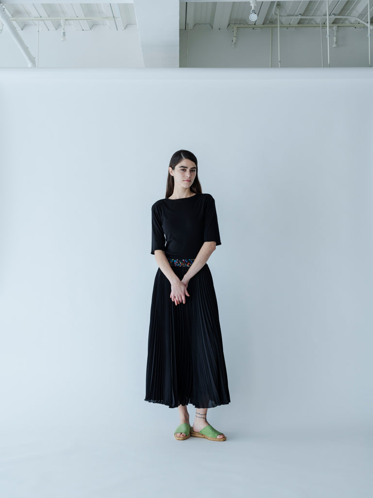 リブのTシャツはともするとカジュアルになりがちですが、このTシャツの一番のポイントは半袖ではなく五分袖なところです。長めの袖が腕を長く綺麗に見せてくれます。