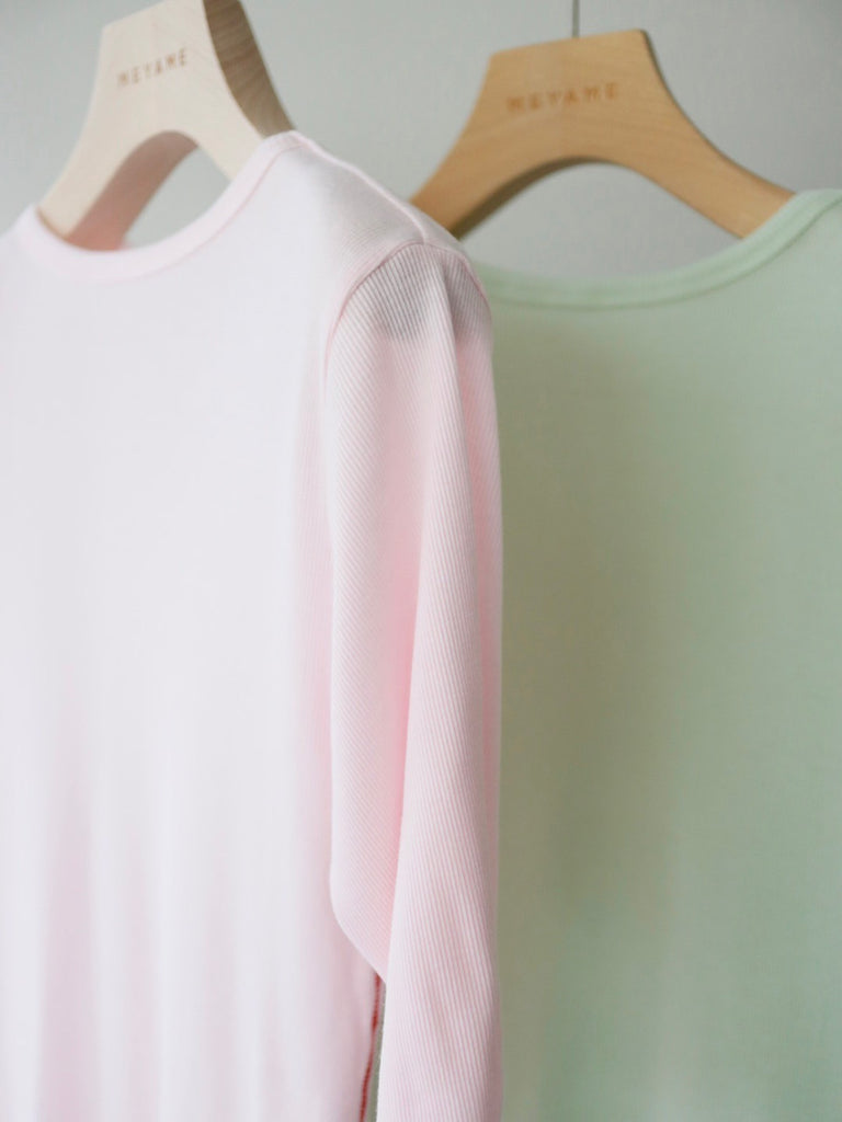 コットンと再生ポリエステルを合わせて、柔らかで尚且つ伸びにくいリブ生地を開発しました。
