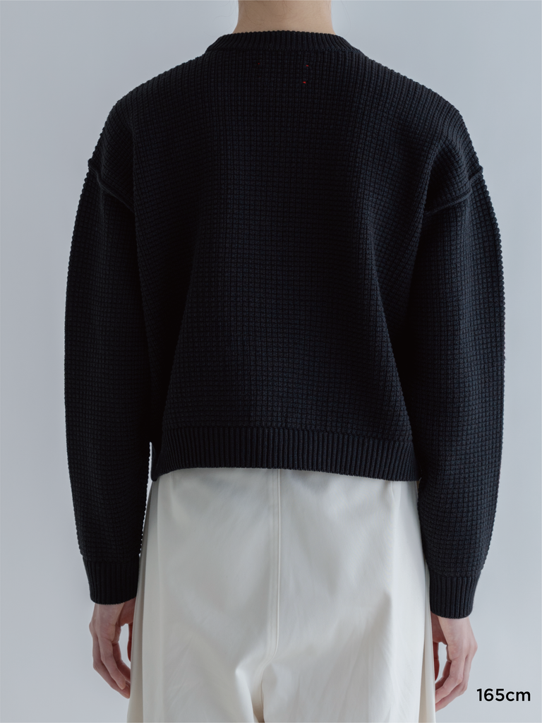 肩のところだけリンキング (ニットの縫い目) をあえて外に出すことで全体を引き締めています。