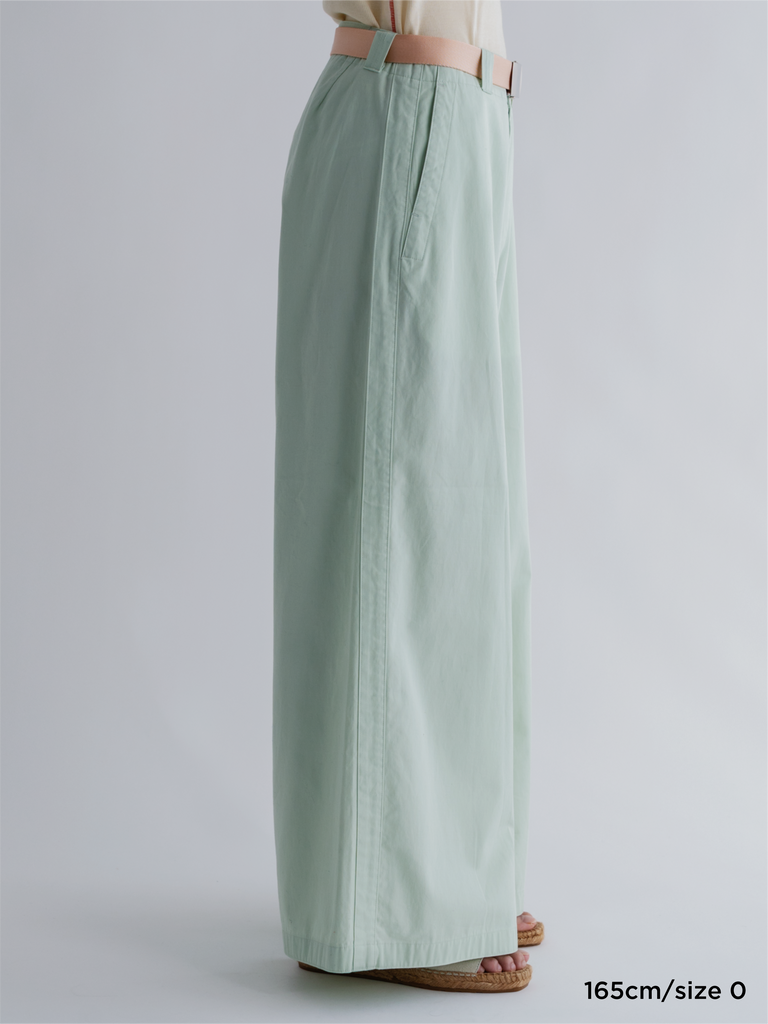 ウエストはワイドなシルエットを作るためにややゆったり目にしていますので、LIGHT BELT などベルトで調整していただくことをおすすめしています。