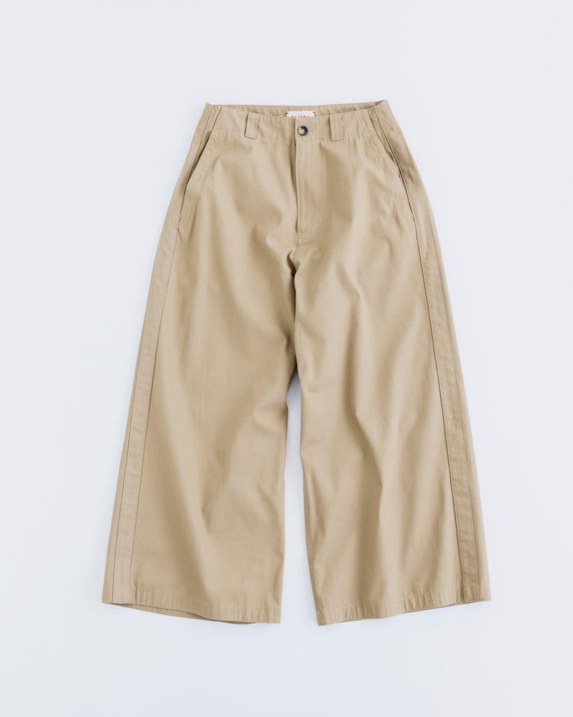 思いっきりワイドなシルエットが特徴の MEYAME の定番パンツ SIDE LINE WIDE PANTS を、この春は落ち着いた光沢と程よい厚みとハリを持つコットンで作りました。年間を通して長く着られる素材です。