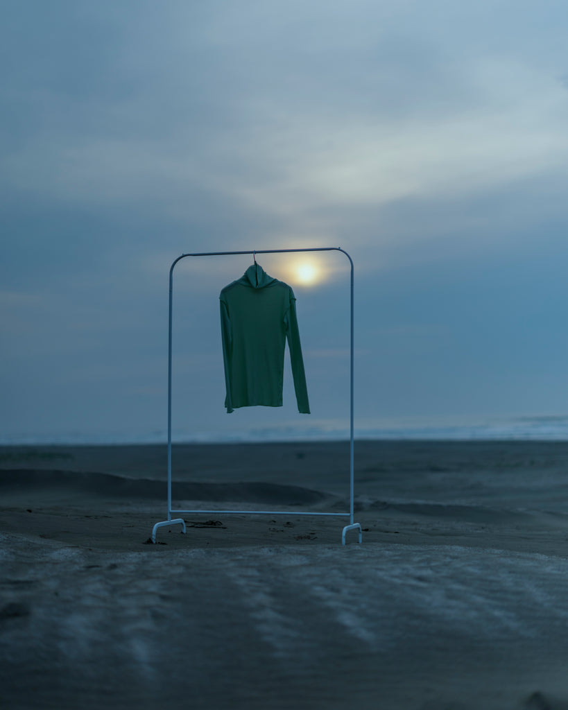 表に出している肩と脇の縫い目がアクセントになり、一枚で着たときも様になります。ネックは折り返してもいいですし、くしゅくしゅさせてもOK。