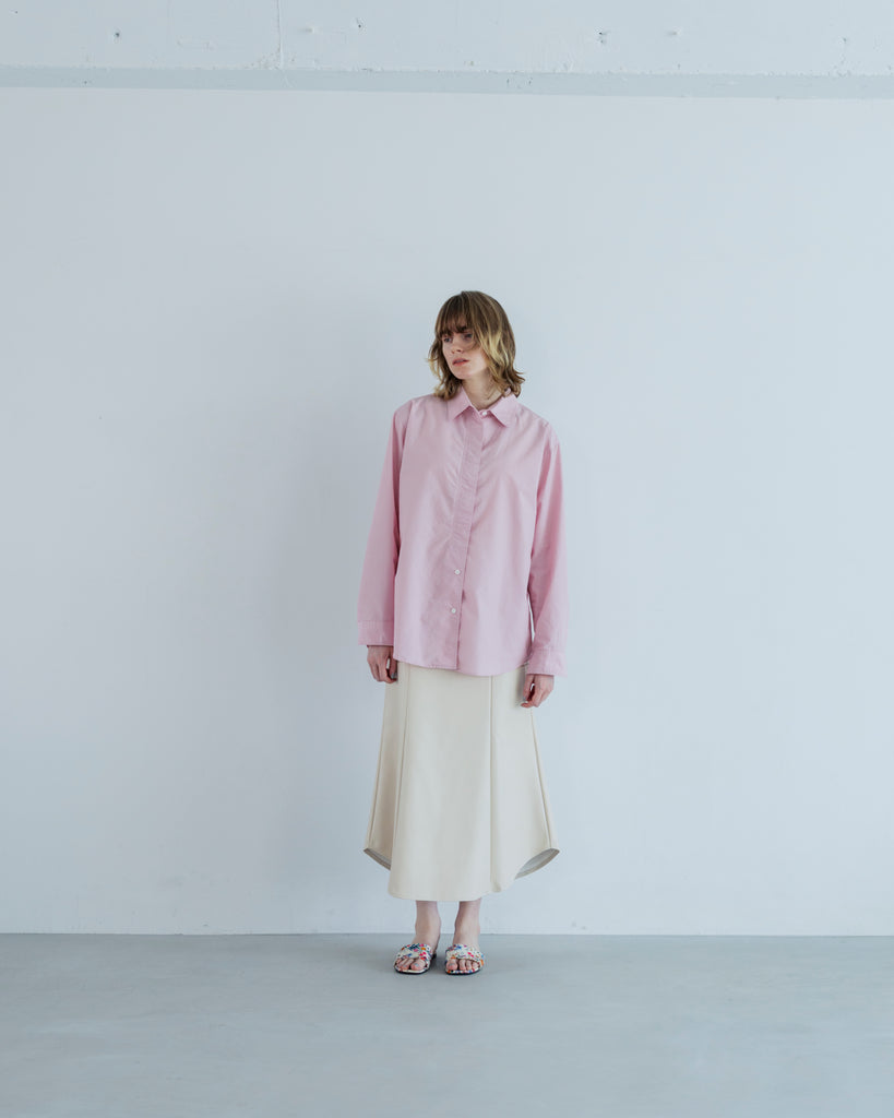 短すぎず長すぎない着丈と、ほどよいゆとりがある身幅なので、インもアウトもしやすく、LOOK のようにスカートともパンツとも合わせやすいシルエットです。