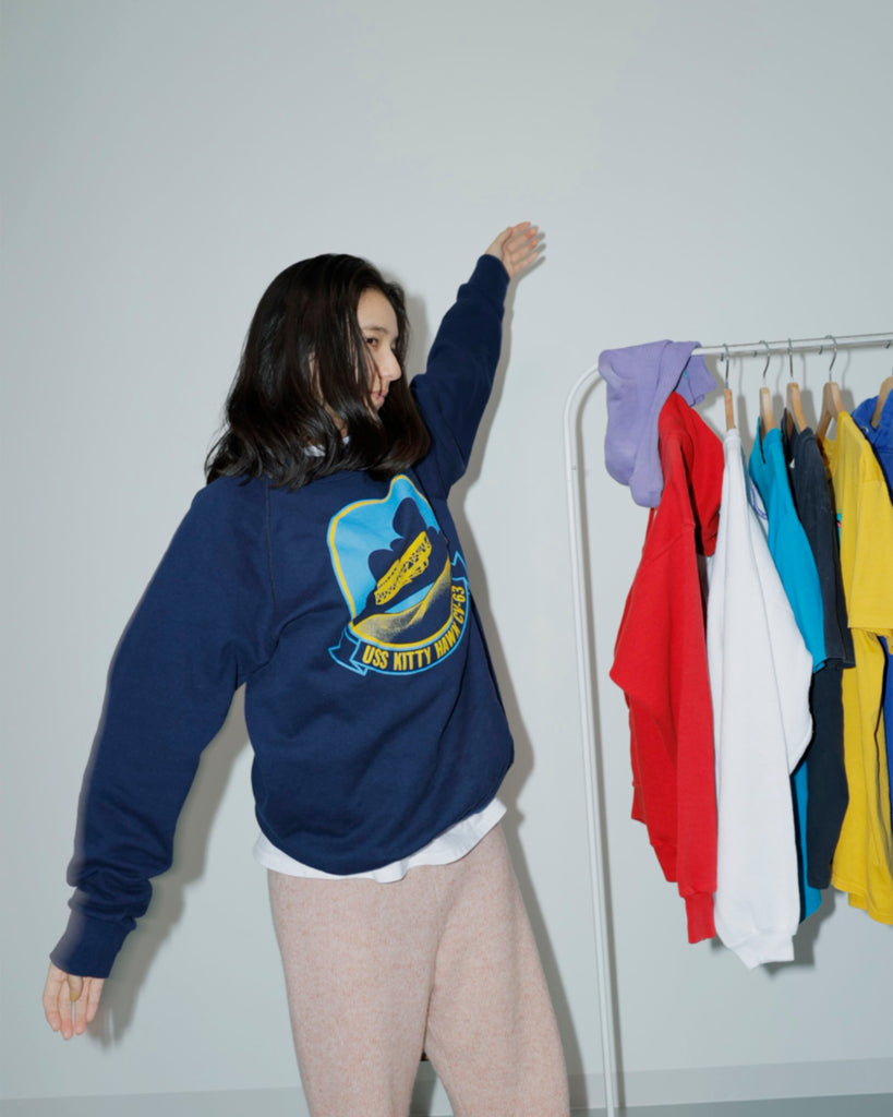 MEYAME ではプリントものをあまり作らないので、古着のスエットやTシャツはプリントものを好んで着ています。今回もプリントものをたくさん買い付けました。普段自分用に買うのと同じように年代や価値のあるなしではなく、好きかどうかを基準に選びました。