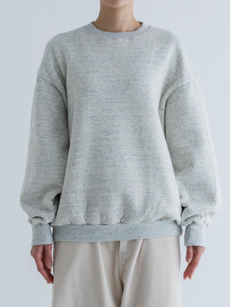 袖に入った切り替え(SWITCHING)、着ると少し丸みを帯びるバランスの取りやすい形、ふわふわとした着心地と暖かさを叶えてくれる裏起毛。